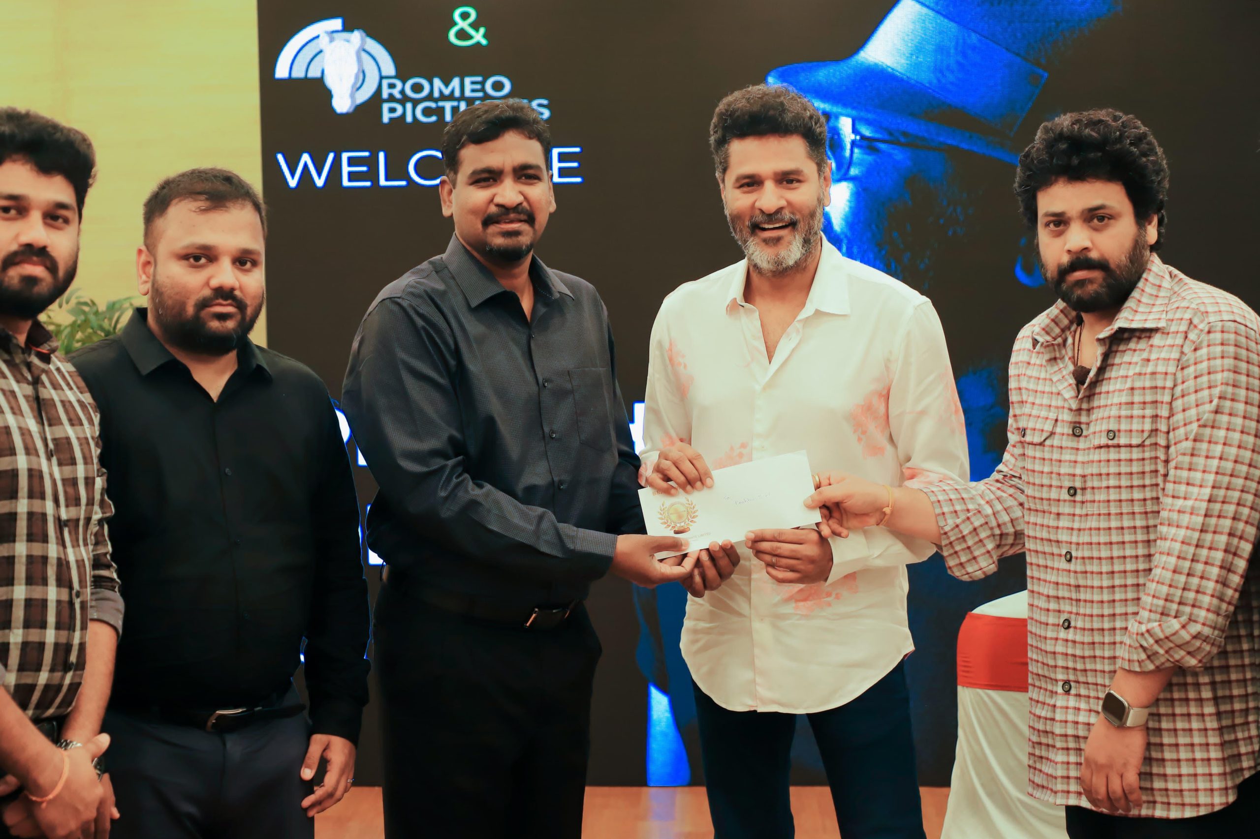Photo (இடது முதல் வலது): கிருஷ்ண குமார் Y (லைன் புரொட்யூசர், பிஹைண்ட்வுட்ஸ் புரொடக்ஷன்), ரமிஸ் ராஜா (எக்ஸிகியூட்டிவ் டைரக்டர், பிஹைண்ட்வுட்ஸ்), மனோஜ் NS (நிறுவனர் மற்றும் சிஇஒ, பிஹைண்ட்வுட்ஸ்), நடிகர் பிரபுதேவா மற்றும் ராகுல் (ரோமியோ பிக்சர்ஸ்).